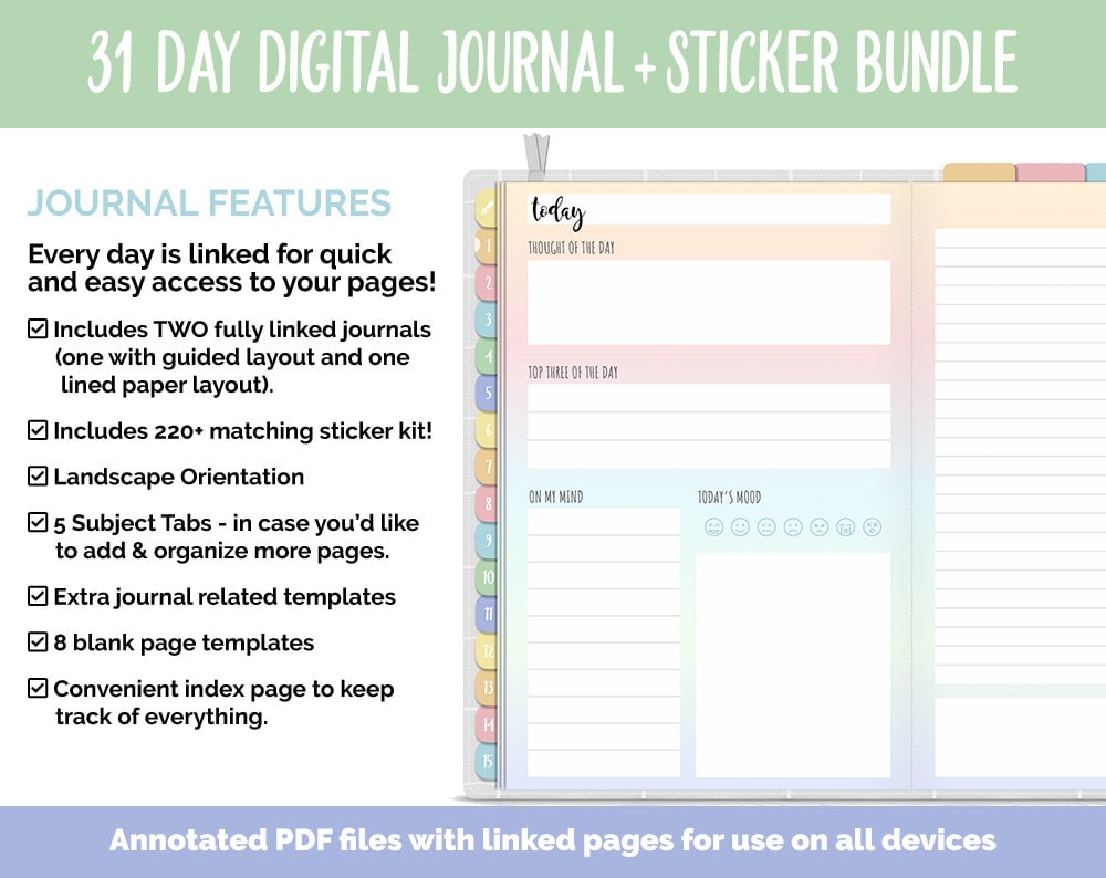 Looking for an easier way to take down notes or keep a daily journal? Introducing the new DPC 31 Day Digital Journals! This listing comes with TWO completely different journals. Both of the journals have linked tabs for all 31 Days, a linked tab for your monthly page and five extra subject tab links for anything extra you might want to put in your journal (plus some bonus templates). One digital journal includes lined paper daily pages on a white background and the other has guided journal sections for the daily pages on a colored background (see listing images). In addition to getting two journals, I've also included a bonus matching digital sticker set! GoodNotes users this comes precropped and for all other apps, I've also included a zip file of all the individual images. For everything that's included see below...