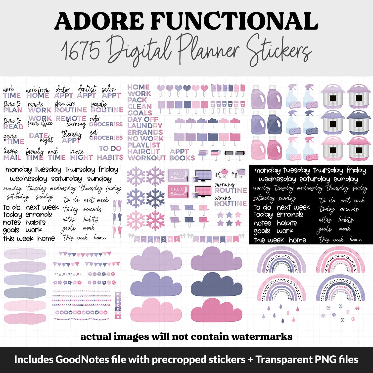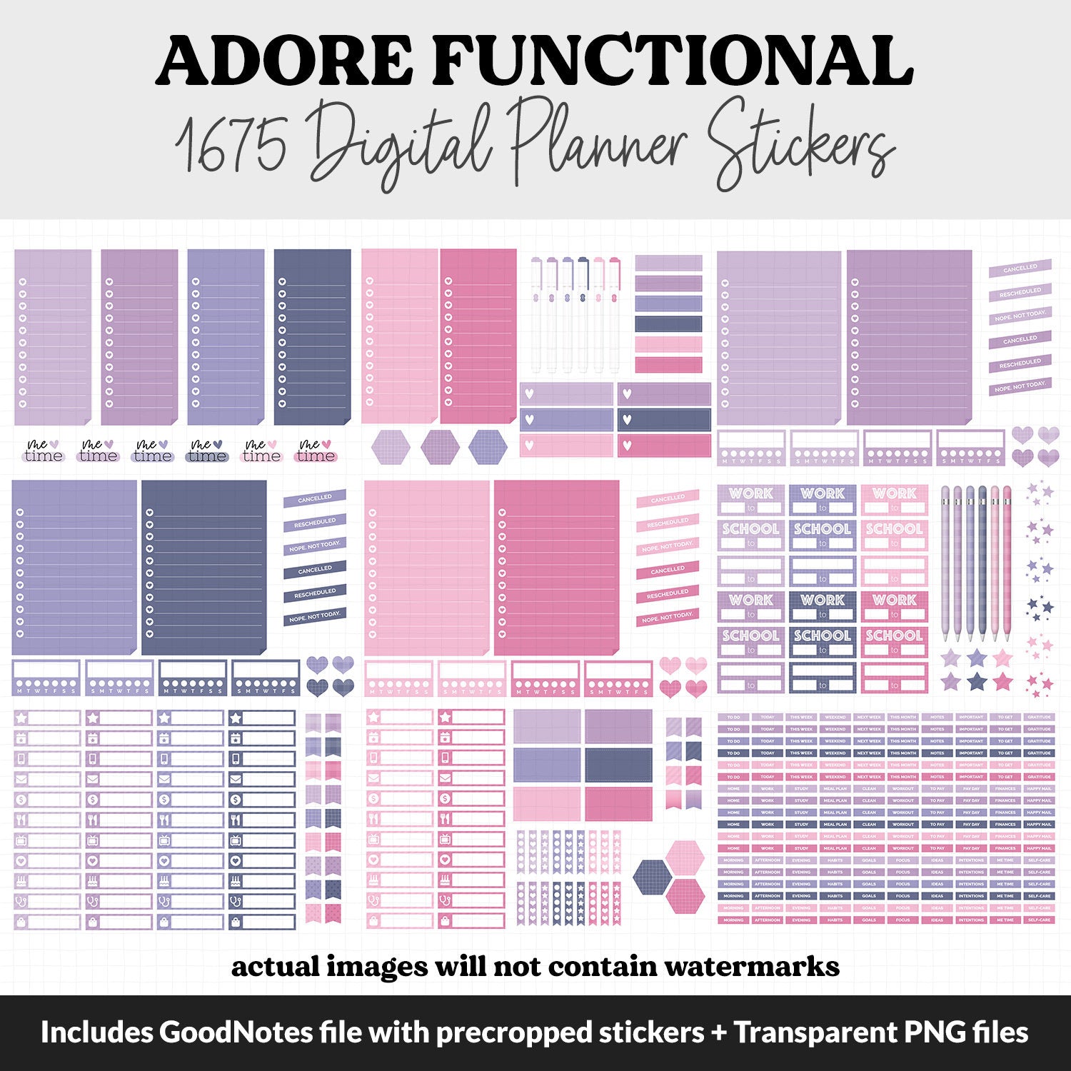 Set up your digital planner with a little flair with these fun functional digital planning stickers in the Adore color scheme! You'll find fun papers, sticky notes, trackers, headers, date stickers, styluses, washi and so much more! In fact, this set has over 1400 functional stickers to help you create your most productive pages. You can check out the listing images for every single digital sticker included. GoodNotes users, this package comes already PRE-CROPPED! Other app users - all the images are saved as INDIVIDUAL files presorted into folders and ready to insert into your pages!