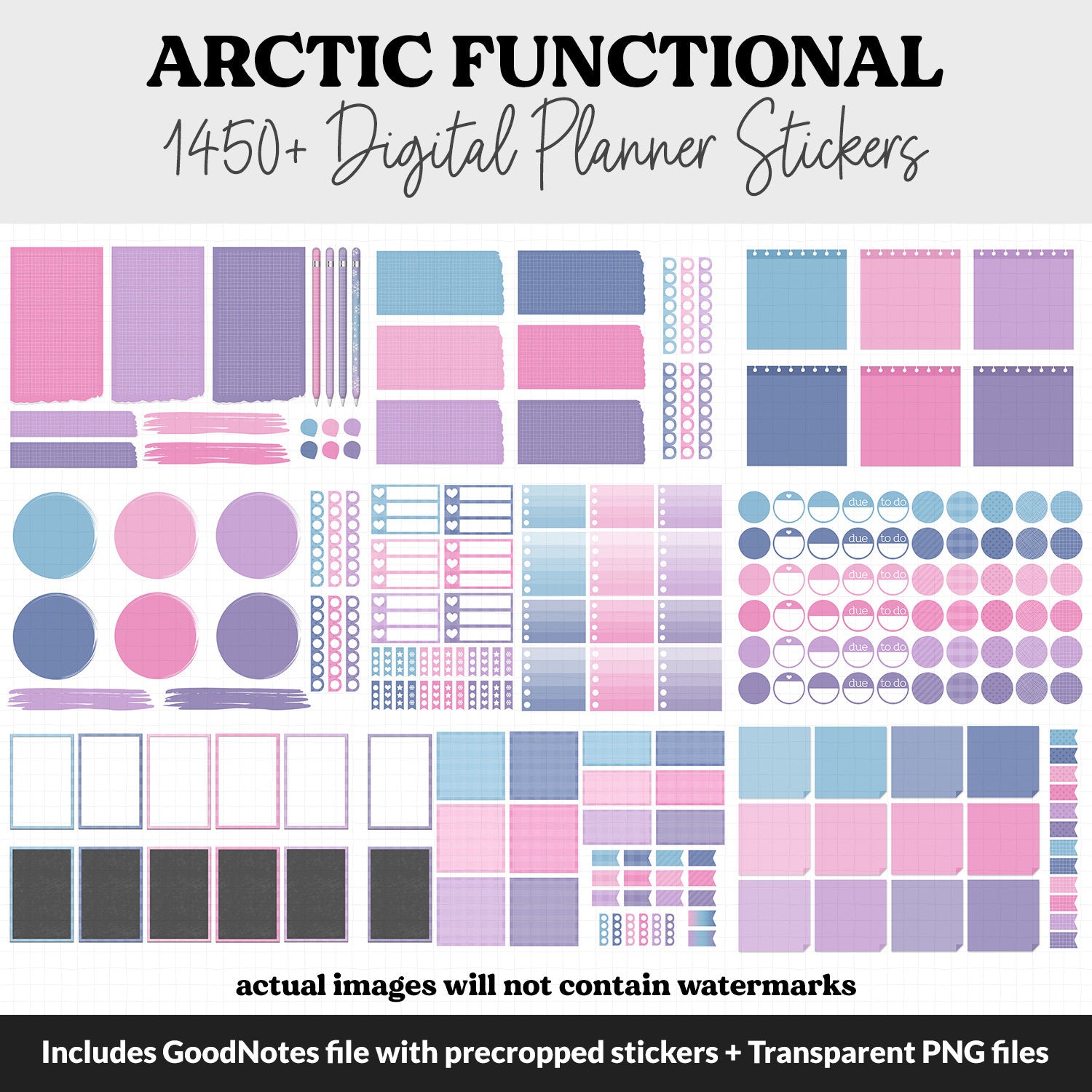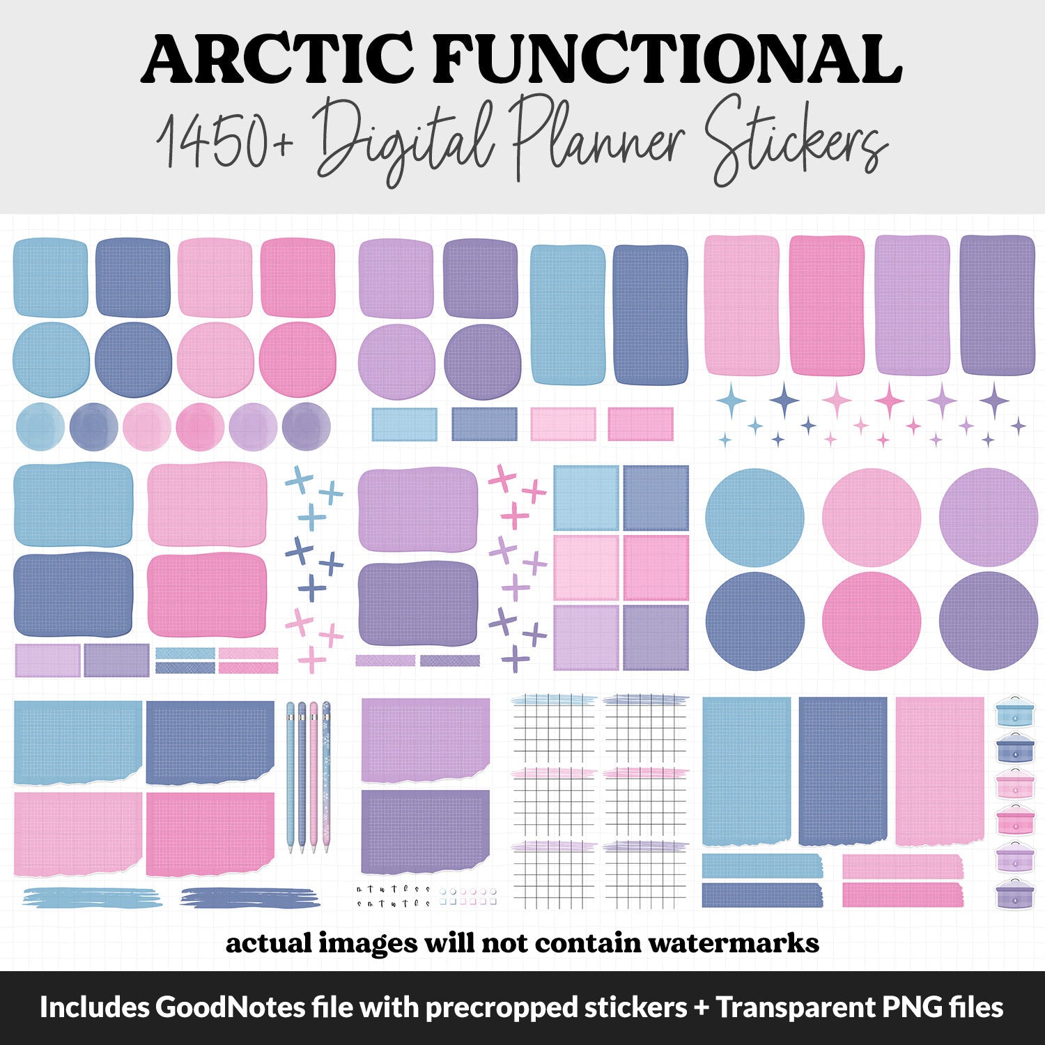 Set up your digital planner with a little flair with these fun functional digital planning stickers in the Arctic color scheme! You'll find fun papers, sticky notes, trackers, headers, date stickers, styluses, washi and so much more! In fact, this set has over 1400 functional stickers to help you create your most productive pages. You can check out the listing images for every single digital sticker included. GoodNotes users, this package comes already PRE-CROPPED! Other app users - all the images are saved as INDIVIDUAL files presorted into folders and ready to insert into your pages!