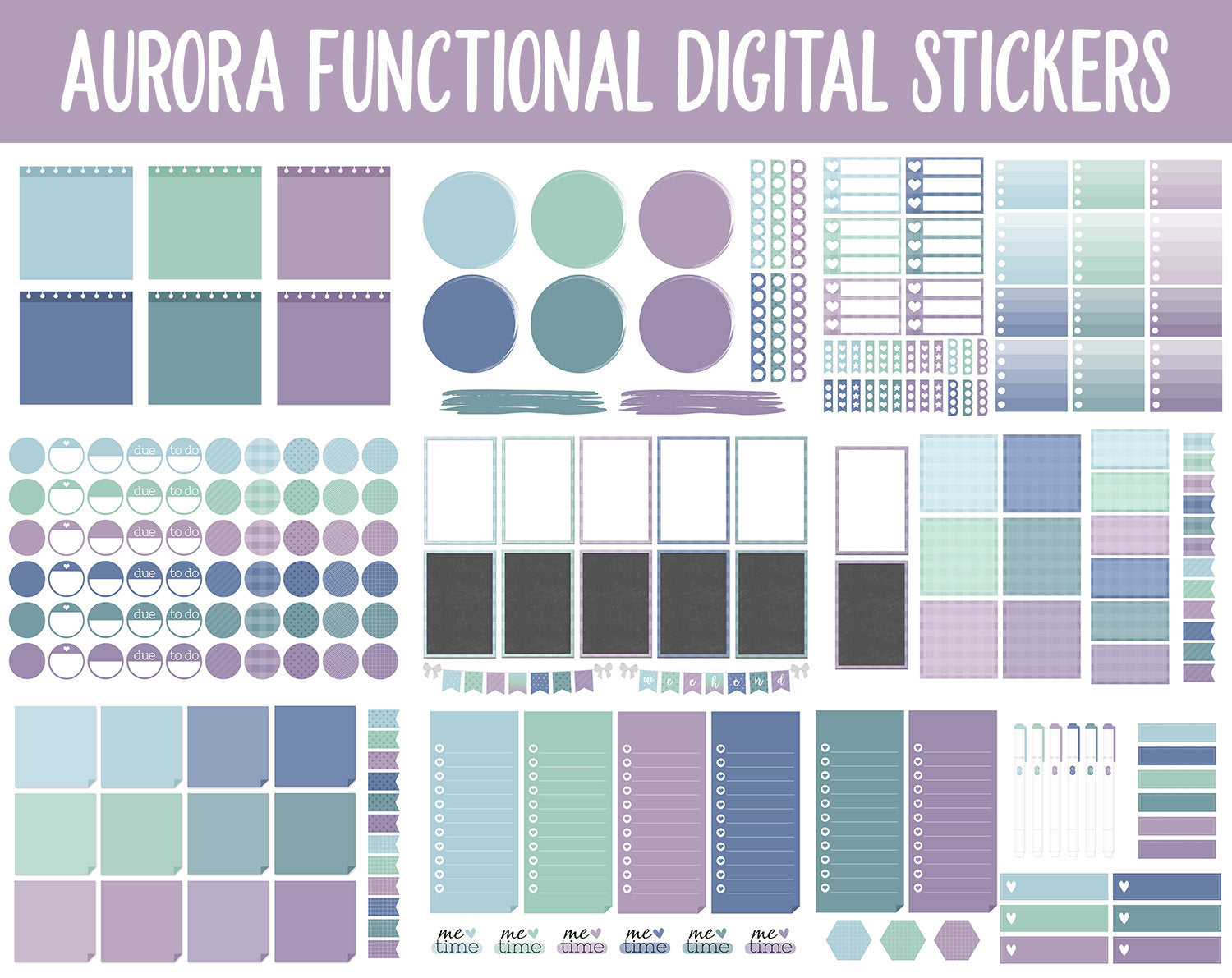 Set up your digital planner with a little flair with these fun functional digital planning stickers in the Aurora color scheme! You'll find fun papers, sticky notes, trackers, headers, date stickers, styluses, washi and so much more! In fact, this set has over 1400 functional stickers to help you create your most productive pages. You can check out the listing images for every single digital sticker included. GoodNotes users, this package comes already PRE-CROPPED! Other app users - all the images are saved as INDIVIDUAL files presorted into folders and ready to insert into your pages!