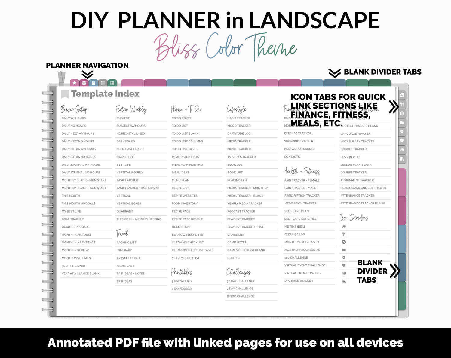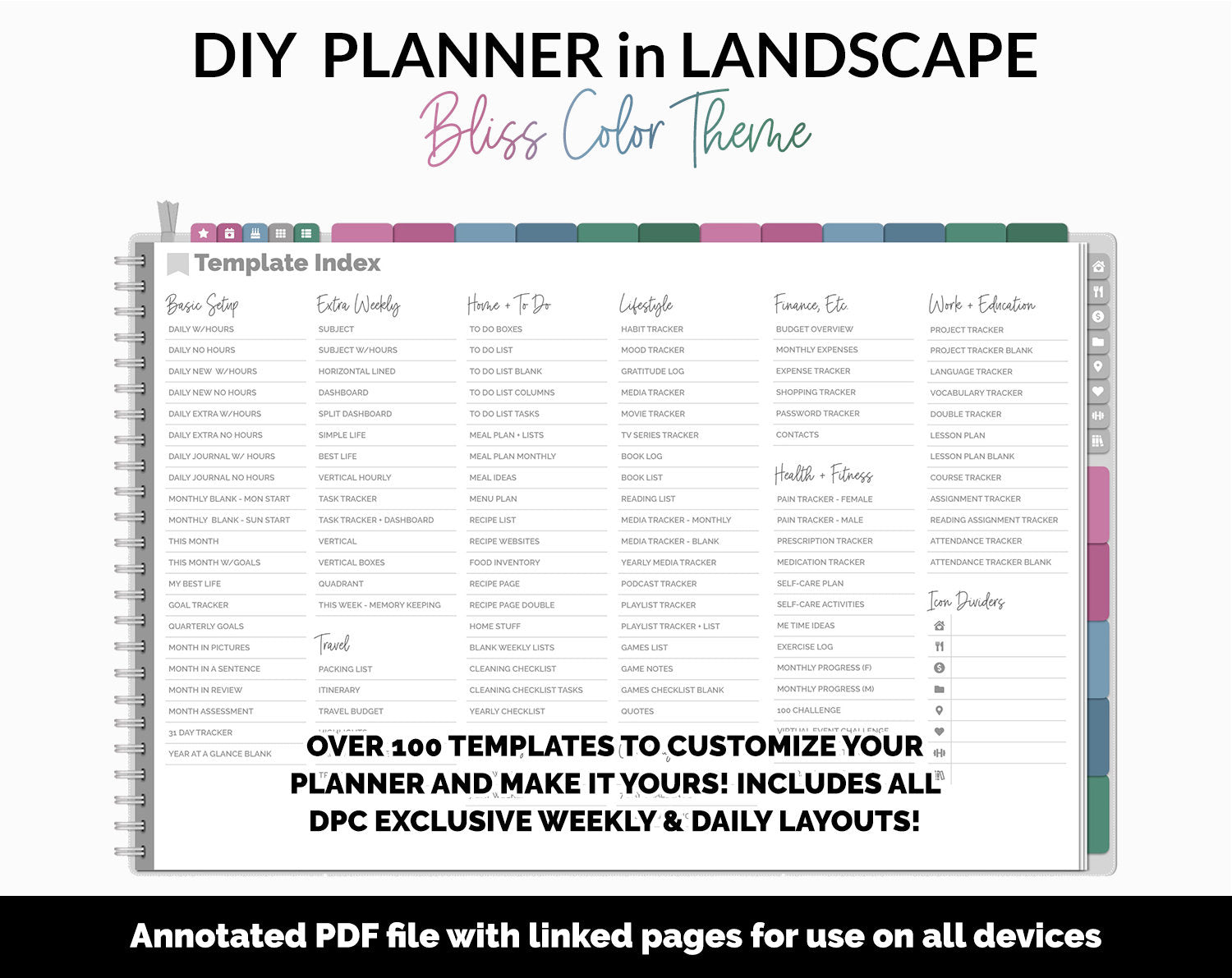 This is a DIY-style digital planner, which allows you to copy and paste any of the over 100 templates anywhere in the planner to truly make it your own. This ultimate flexibility allows you to use it as a bullet journal, planner, or notebook! For structuring your digital planner, you will find eight icon lifestyle divider tabs at the right side for quick and easy access to your planner pages as well as 18 blank tab dividers. The over 100 templates provided include multiple daily, weekly and monthly layouts as well as templates covering categories from home, work, lifestyle, fitness/health, budget and so much more!