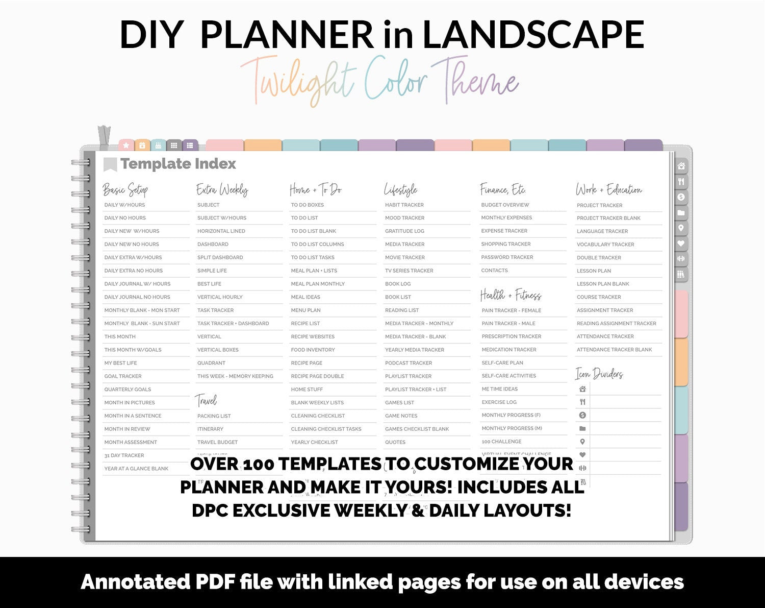 This is a DIY-style digital planner, which allows you to copy and paste any of the over 100 templates anywhere in the planner to truly make it your own. This ultimate flexibility allows you to use it as a bullet journal, planner, or notebook! For structuring your digital planner, you will find eight icon lifestyle divider tabs at the right side for quick and easy access to your planner pages as well as 18 blank tab dividers. The over 100 templates provided include multiple daily, weekly and monthly layouts as well as templates covering categories from home, work, lifestyle, fitness/health, budget and so much more!