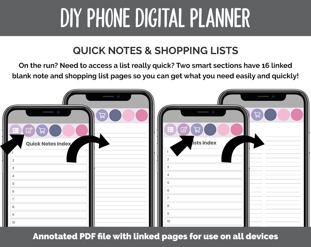 Now you can stay on top of your digital planning no matter where you are! This version has tons of optimizations specific to phone users including optimized planning space, large buttons for use with fingers, quick links and more! This is a DIY style planner that also includes prelinked quick links and shopping list pages for easy reference. In addition, you’ll find 40 blank pages and templates that you can copy and paste anywhere in the notebook to truly make it your own - use it as a bullet journal, planner, or notebook! You’ll also find three blank buttons to use to create your own sections. To see exactly what’s included, see below...