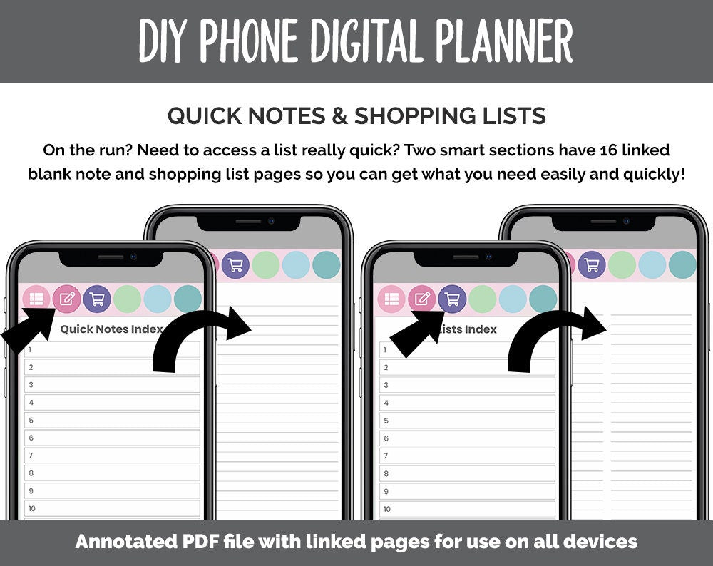 Now you can stay on top of your digital planning no matter where you are! This version has tons of optimizations specific to phone users including optimized planning space, large buttons for use with fingers, quick links and more! This is a DIY style planner that also includes prelinked quick links and shopping list pages for easy reference. In addition, you’ll find 40 blank pages and templates that you can copy and paste anywhere in the notebook to truly make it your own - use it as a journal, planner, or notebook! You’ll also find three blank buttons to use to create your own sections. To see exactly what’s included, see below...