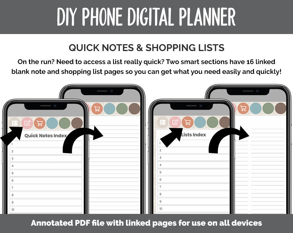 Now you can stay on top of your digital planning no matter where you are! This version has tons of optimizations specific to phone users including optimized planning space, large buttons for use with fingers, quick links and more! This is a DIY style planner that also includes prelinked quick links and shopping list pages for easy reference. In addition, you’ll find 40 blank pages and templates that you can copy and paste anywhere in the notebook to truly make it your own - use it as a bullet journal, planner, or notebook! You’ll also find three blank buttons to use to create your own sections. To see exactly what’s included, see below...