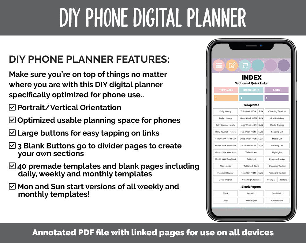 Now you can stay on top of your digital planning no matter where you are! This version has tons of optimizations specific to phone users including optimized planning space, large buttons for use with fingers, quick links and more! This is a DIY style planner that also includes prelinked quick links and shopping list pages for easy reference. In addition, you’ll find 40 blank pages and templates that you can copy and paste anywhere in the notebook to truly make it your own - use it as a bullet journal, planner, or notebook! You’ll also find three blank buttons to use to create your own sections. To see exactly what’s included, see below...