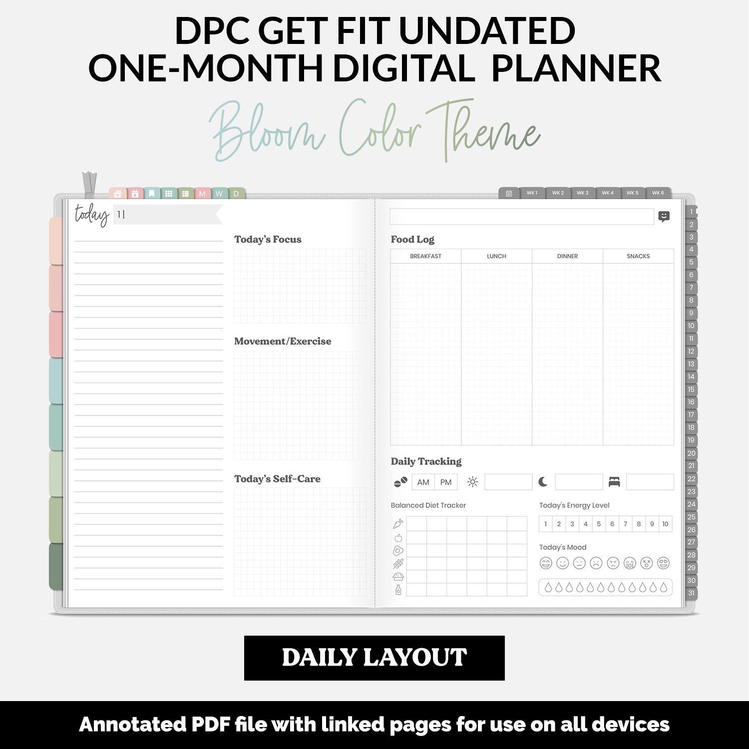 The latest update of the DPC Get Fit Planner is here! This version is 31-day undated monthly digital planner with monthly, weekly and daily pages already linked for you. The weekly and daily pages are specifically designed to help you stay on track of your health and wellness goals. The monthly format is perfect for a new reset/approach to your goals each month and works well with 30-day style challenges.