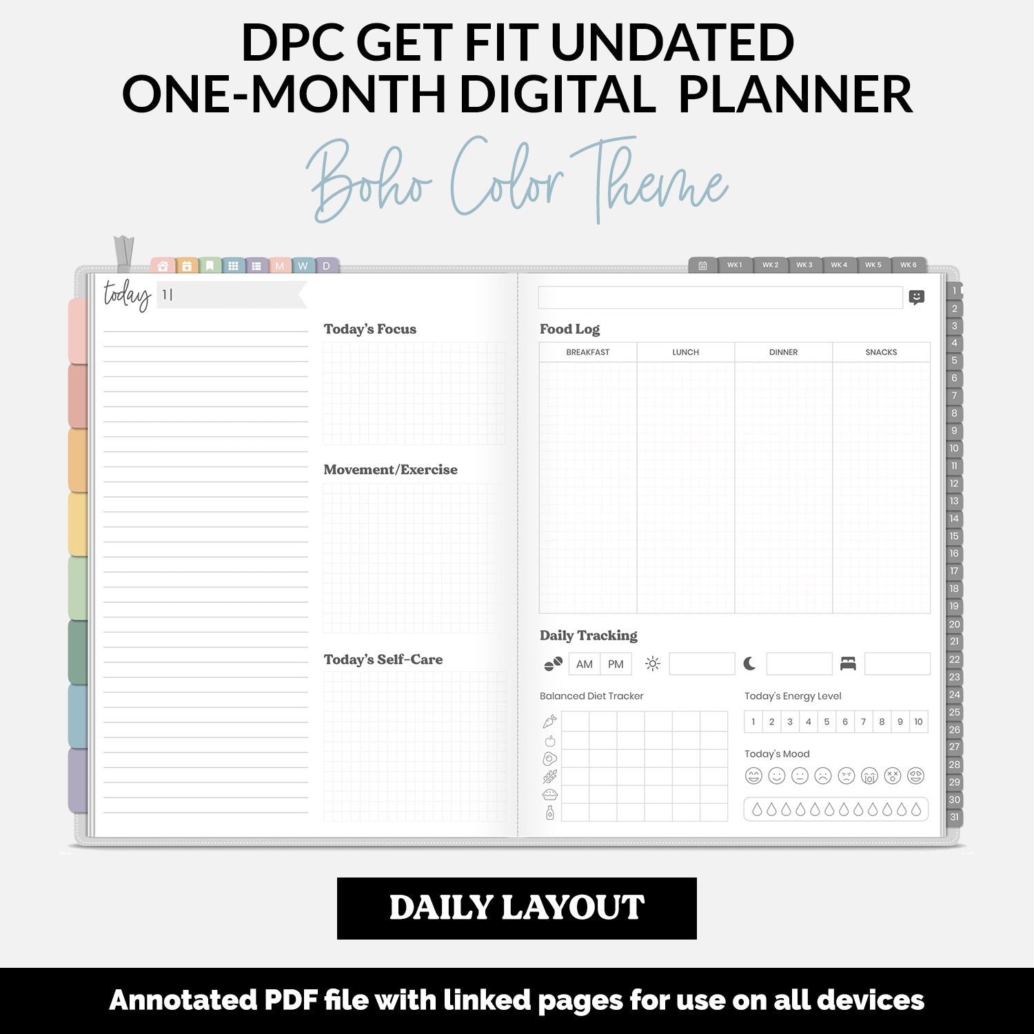 The latest update of the DPC Get Fit Planner is here! This version is 31-day undated monthly digital planner with monthly, weekly and daily pages already linked for you. The weekly and daily pages are specifically designed to help you stay on track of your health and wellness goals. The monthly format is perfect for a new reset/approach to your goals each month and works well with 30-day style challenges.