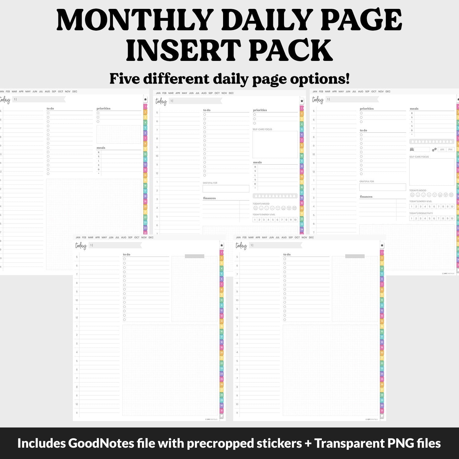 Want to add daily pages to the new DPC Portrait planners? These are the perfect solution! Just insert the pack wherever you'd like to have your daily pages right into your planner. Each listing comes with five different daily insert pack versions in both 31-day and 30-day options. Match the colors to your planner, or add a little variety and mix and match the color schemes!