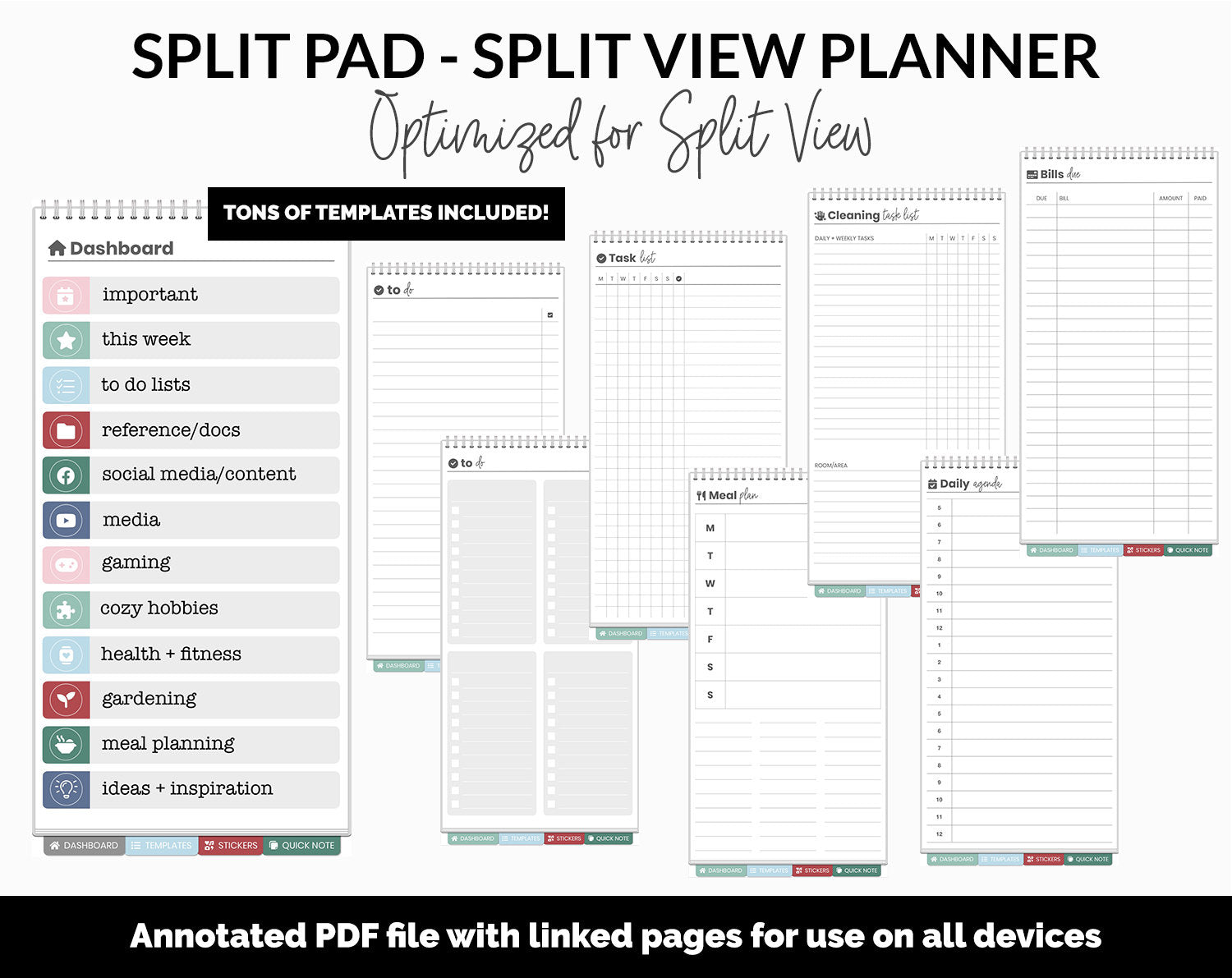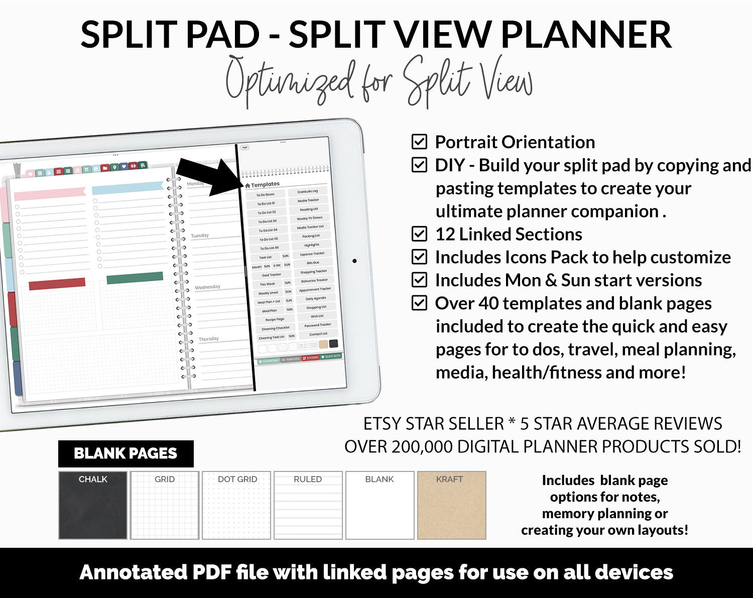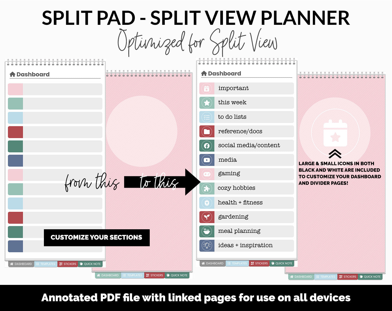 Introducing the Split Pad! Now you can take the best advantage of split-screen functionality with this digital planner companion optimized for split view! The DPC Split Pad comes with a dashboard of 12 linked divider sections ready for you to personalize for your needs. To help get you started with setting up your Split Pad, you'll find over 40 templates and blank pages such as to-do lists, trackers and much more! Even better, you can customize your Split Pad even more with the included icons sticker pack. This pack includes 78 icons in both black and white and in large and small to customize both the dashboard and the divider pages.