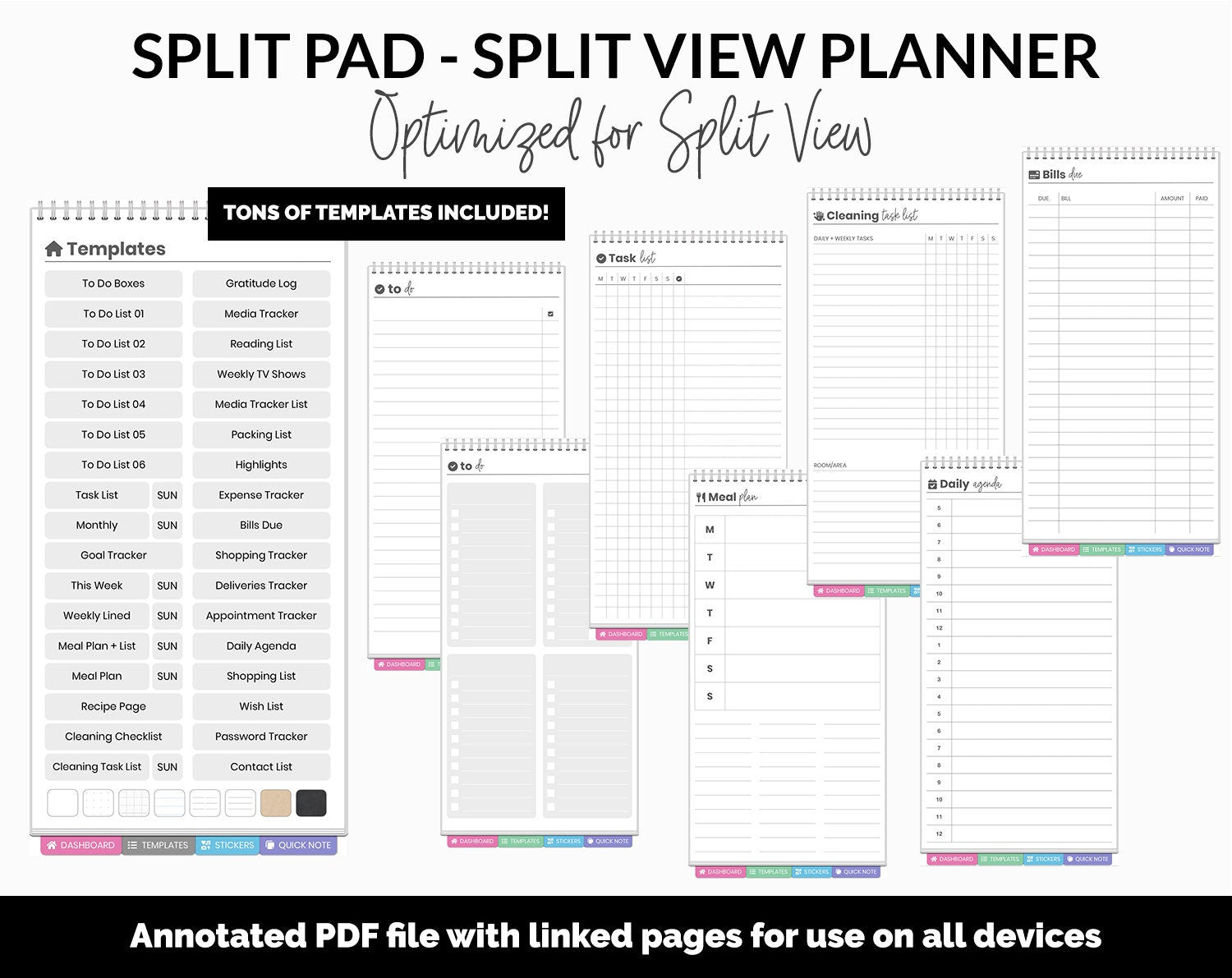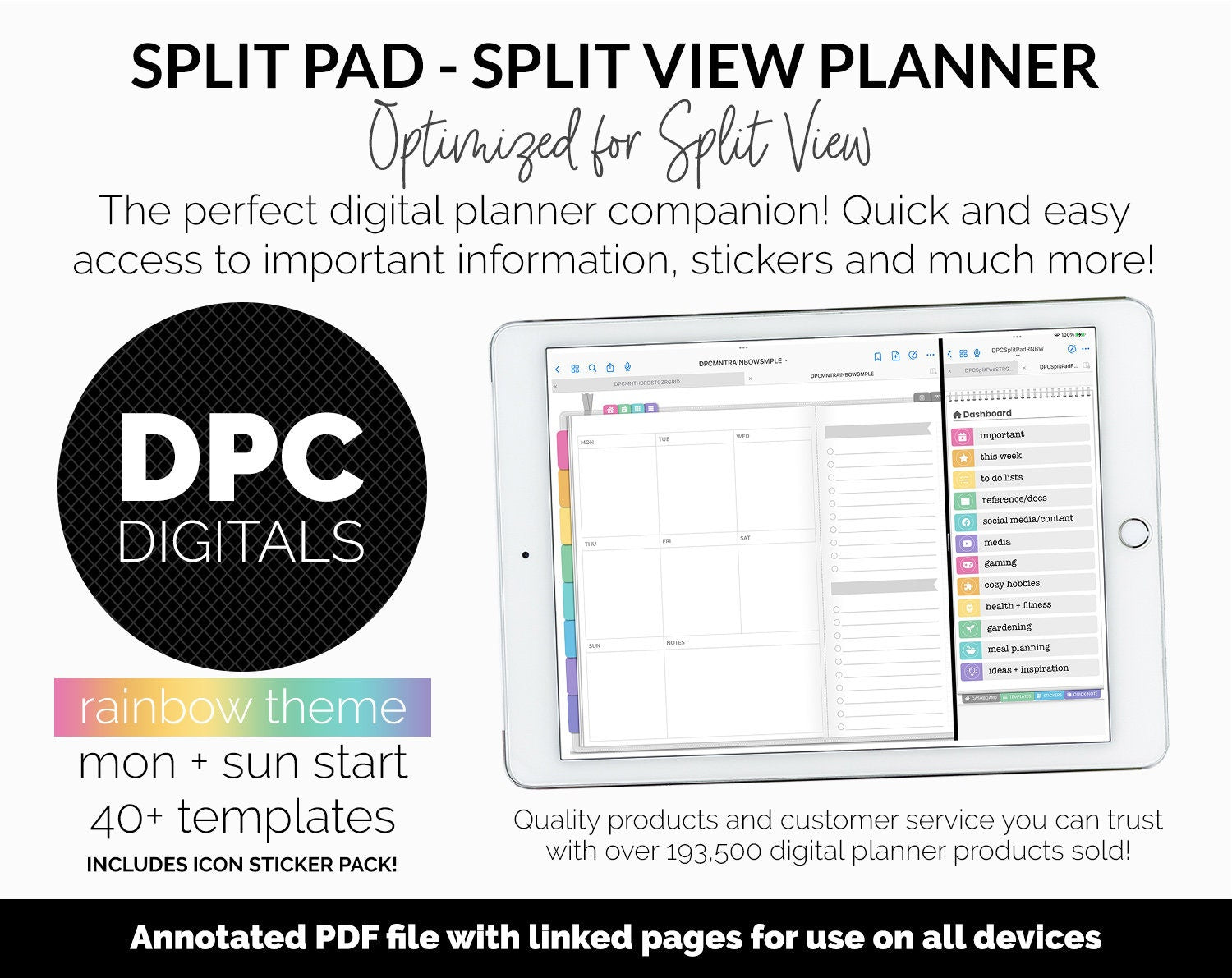 Introducing the Split Pad! Now you can take the best advantage of split-screen functionality with this digital planner companion optimized for split view! The DPC Split Pad comes with a dashboard of 12 linked divider sections ready for you to personalize for your needs. To help get you started with setting up your Split Pad, you'll find over 40 templates and blank pages such as to-do lists, trackers and much more! Even better, you can customize your Split Pad even more with the included icons sticker pack. This pack includes 78 icons in both black and white and in large and small to customize both the dashboard and the divider pages.