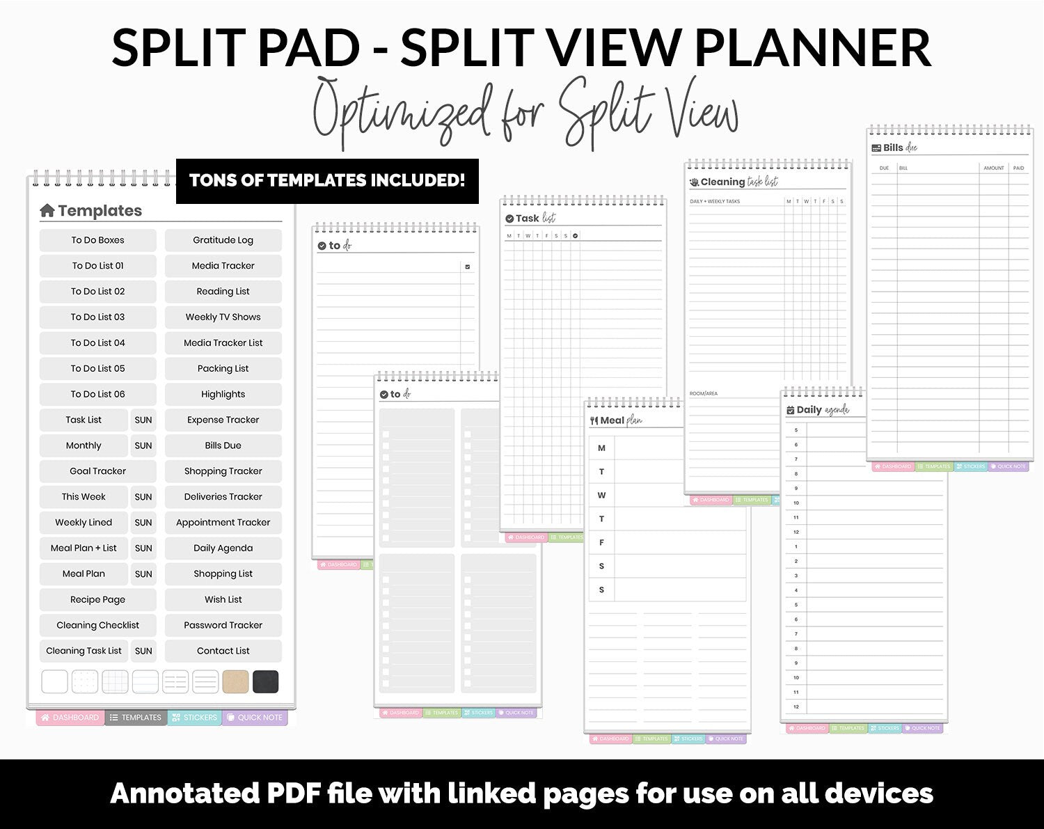 Introducing the Split Pad! Now you can take the best advantage of split-screen functionality with this digital planner companion optimized for split view! The DPC Split Pad comes with a dashboard of 12 linked divider sections ready for you to personalize for your needs. To help get you started with setting up your Split Pad, you'll find over 40 templates and blank pages such as to-do lists, trackers and much more! Even better, you can customize your Split Pad even more with the included icons sticker pack. This pack includes 78 icons in both black and white and in large and small to customize both the dashboard and the divider pages.