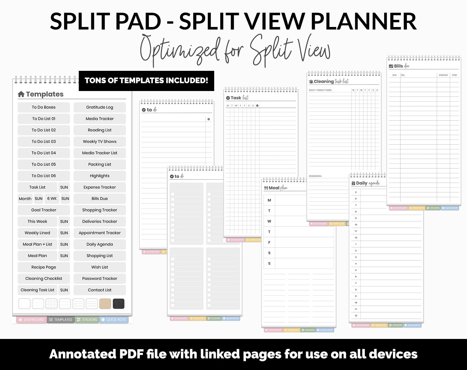 Introducing the Split Pad! Now you can take the best advantage of split-screen functionality with this digital planner companion optimized for split view! The DPC Split Pad comes with a dashboard of 12 linked divider sections ready for you to personalize for your needs. To help get you started with setting up your Split Pad, you'll find over 40 templates and blank pages such as to-do lists, trackers and much more! Even better, you can customize your Split Pad even more with the included icons sticker pack. This pack includes 78 icons in both black and white and in large and small to customize both the dashboard and the divider pages.