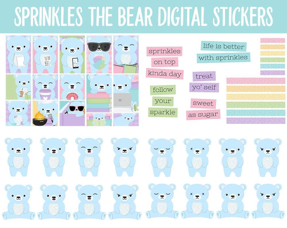 Introducing, Sprinkles the Bear! This cutie is ready to help you add a little bit of something extra to all of your life activities. You'll find her in this new mini set doing tons of everyday activities perfect for documenting in your digital planner pages. GoodNotes users, this package comes already PRE-CROPPED! Other app users - all the images are saved as INDIVIDUAL files and ready to insert into your pages!